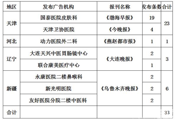 其中天津發(fā)布虛假違法中醫(yī)醫(yī)療廣告情況較為嚴(yán)重,國泰醫(yī)院皮膚科在《渤海早報(bào)》發(fā)布19條次,天津衛(wèi)協(xié)醫(yī)院在《今晚報(bào)》發(fā)布4條次。河北省的動(dòng)力醫(yī)院外二科在《燕趙都市報(bào)》發(fā)布1條次。遼寧省的大連天興中醫(yī)胃腸鏡中心和聯(lián)合康美醫(yī)療中心在《大連晚報(bào)》分別發(fā)布2條次、1條次。新疆維吾爾自治區(qū)的永康醫(yī)院二樓鼻喉科、新光明醫(yī)院、友好醫(yī)院分院二樓中醫(yī)科在《烏魯木齊晚報(bào)》各發(fā)布2條次。具體名單見下: